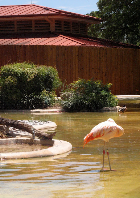 No, Flamingo al Fresco isn't some kind of dish. The flamingos at Sea World were outside- they weren't even in a cage! There was a shallow pool filled with flamingos, ibises, and many kinds of ducks. It was really ovely. The pink of the flamingos, the red of the ibises, the orange of the water, the green of the plants, and the reddish brown of the surrounding buildings all blended together to create a rather striking visual. Most of the flamingos were gathered together at one end of their habitat, but this one was all off by itself. This was just a little after noon, and the sun was extremely high in the sky, making it pretty hot. But, that sun shone down almost directly on the top of this flamingo, making it basically glow.